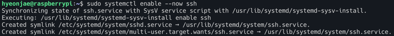 아래와 같이 라즈베리 파이OS에서는 sshd로 명명된 데몬이라할지라도 ssh.service로 등록되어 있어서 sudo systemctl enable --now ssh