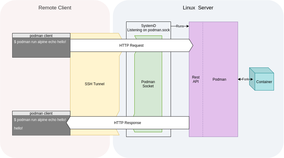 소켓 활성화를 통해 Podman서비스로 연결하며 Podman명령어는 서버에서 실행된다. 따라서 Podman이 로컬에서 실행되는 것처럼 보이는 것이다.