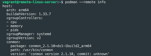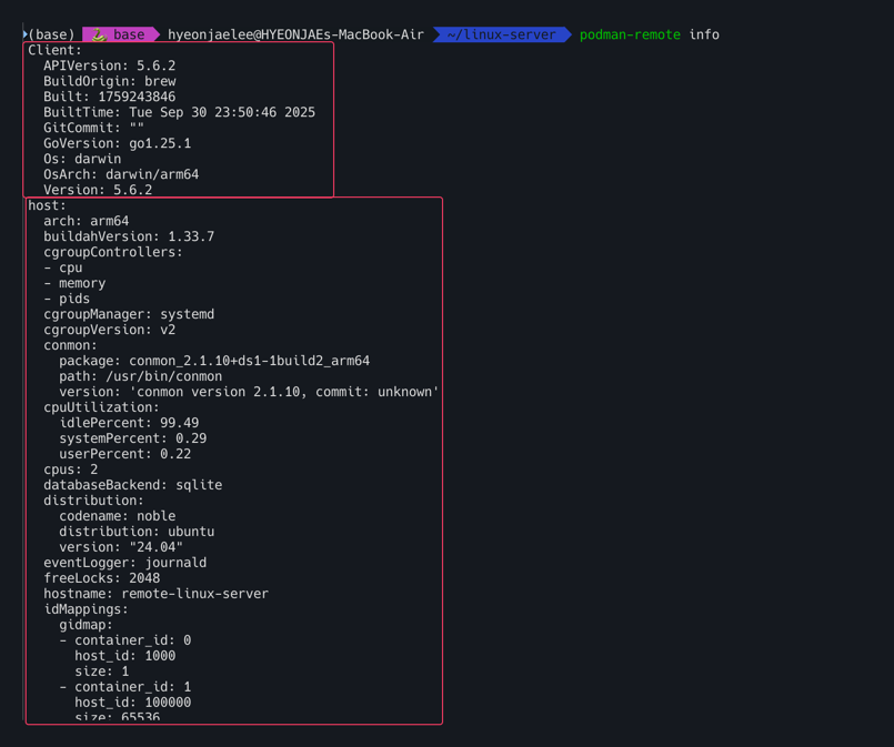 - 실제 Podman 명령은 원격 서버에서 실행된다.
