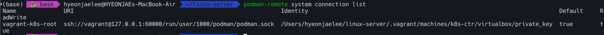 podman-remote system connection add vagrant-k8s-root \ --identity <PRIVATE_KEY_PATH> \ ssh://vagrant@127.0.0.1:60000/run/user/1000/podman/podman.sock