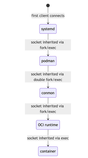 Podman 3.4.0 버전부터 컨테이너의 소켓 활성화, 즉 소켓 활성화된 소켓을 컨테이너에 전달하는 기능을 지원한다. Podman의 fork/exec 모델 덕분에 소켓은 먼저 common에 상속되고 그 다음 OCI 런타임에 상속되며 마지막으로 컨테이너로 상속된다.