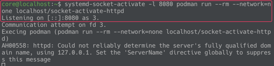 systemd-socket-activate -l 8080 podman run --rm --network=none localhost/socket-activate-httpd