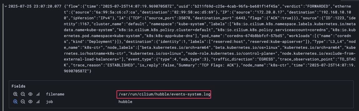 이라는 파일이름의 로그 구성이 생성되고, 해당 필터에 맞는 Flow만 /var/run/cilium/hubble/events-system.log