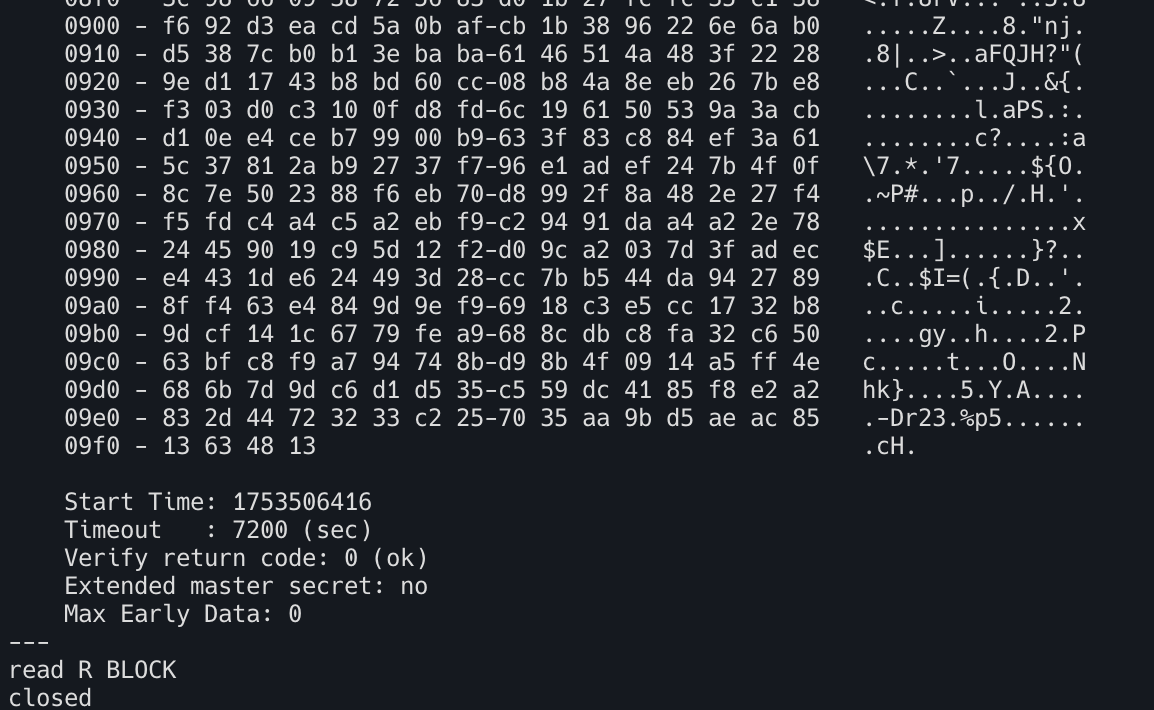 라는 섹션이 있는데 이 섹션이 있으면 클라이언트 인증서가 유효하고 TLS 세션이 설정되었음을 나타낸다. 연결이 종료된 후 출력되는 TLS 세션 요약도 TLS 세션의 지표로 활용할 수 있다.