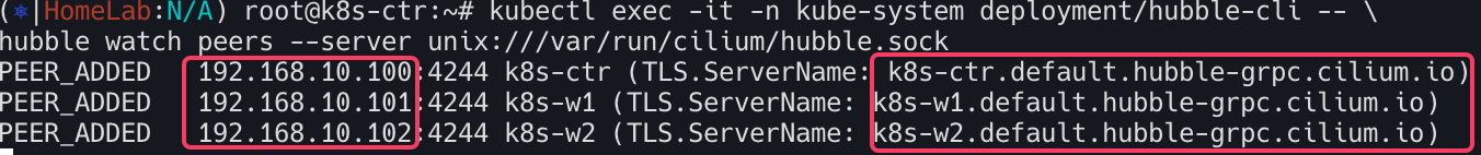 새롭게 생성된 파드 내에서 hubble watch peers