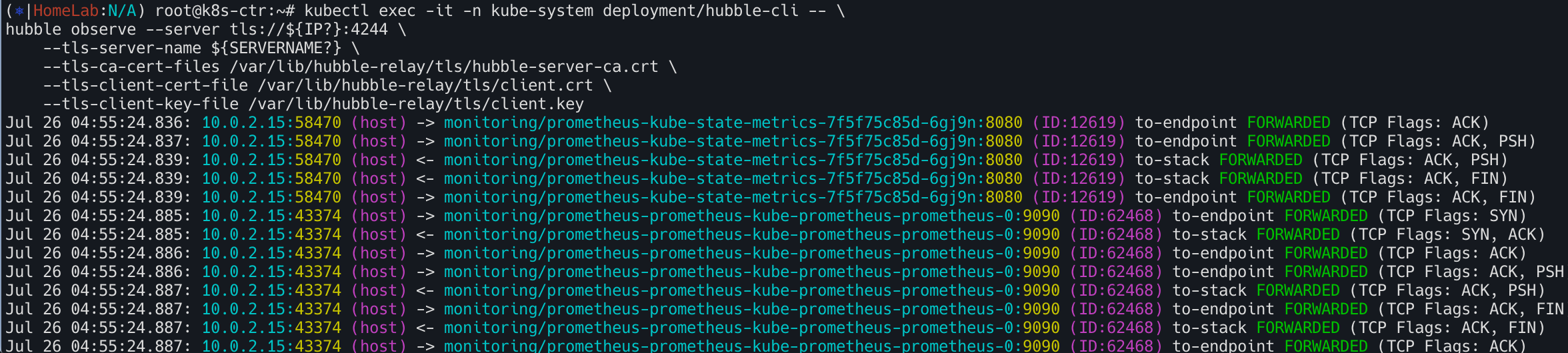 $ kubectl exec -it -n kube-system deployment/hubble-cli -- \
