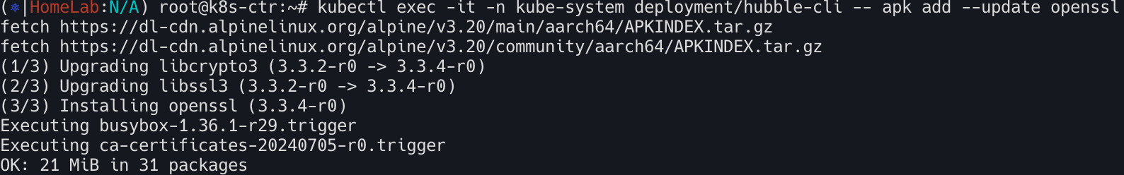 kubectl exec -it -n kube-system deployment/hubble-cli -- apk add --update openssl