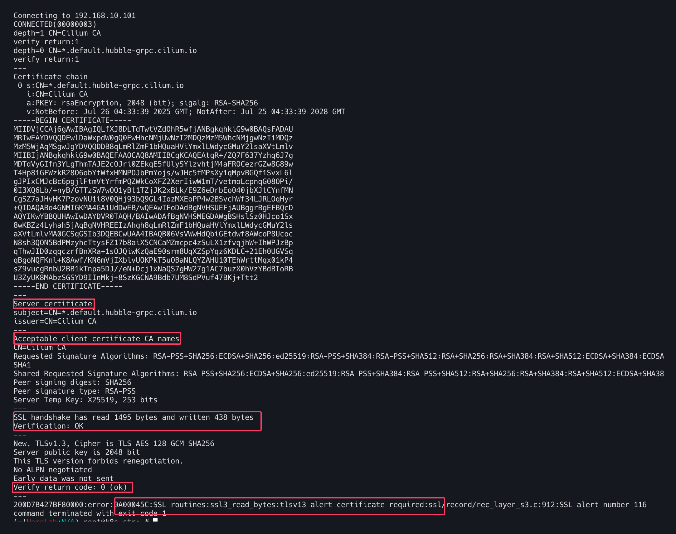 Hubble CLI 파드에서 OpenSSL을 설치 후 Hubble 서버에 연결한다. TLS 핸드쉐이크에 대한 자세한 내용을 확인하여 디버깅할 수 있다.
