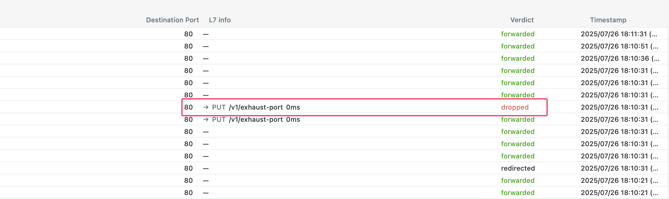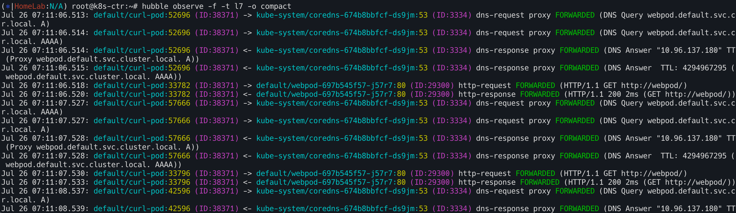 Monitoring Datapath State는 datapath state에 대한 성찰을 제공하지만, 기본적으로 L3/L4 패킷 이벤트에 대한 가시성만 제공한다. 따라서 L7 프로토콜 가시성을 원한다면 L7 Cilium Network Policies 을 사용해야한다. 실제 L7동작처리는 cilium-envoy