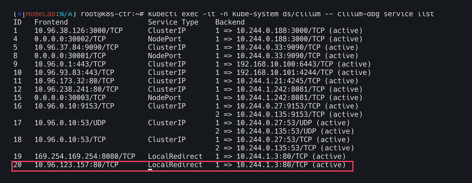 kubectl exec -it -n kube-system cilium-5ngzd -- cilium-dbg service list