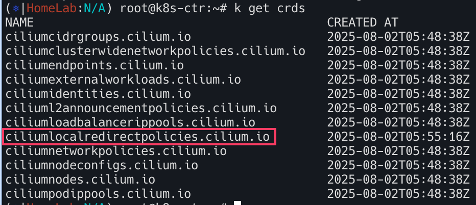 Cilium Local Redirect Policy CRD가 등록되어있는지 확인한다.