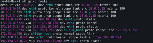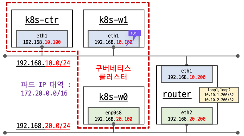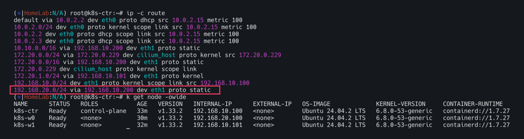k8s-ctr과 k8s-w1의 라우팅 정보를 보면 192.168.10.0/24