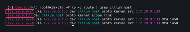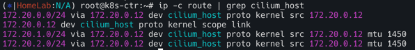 for i in w1 w0 ; do echo ">> node : k8s-$i <<"; sshpass -p 'vagrant' ssh vagrant@k8s-$i ip -c route | grep cilium_host ; echo; done