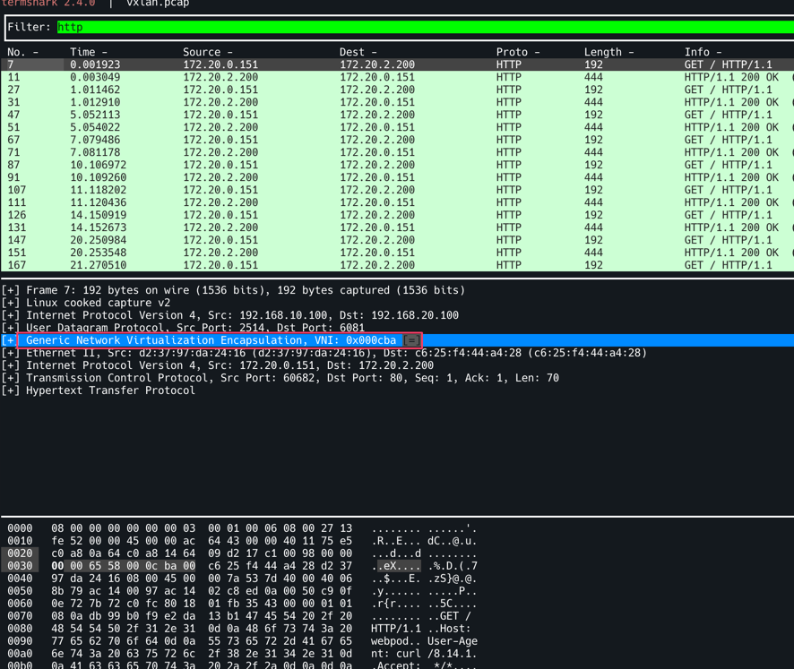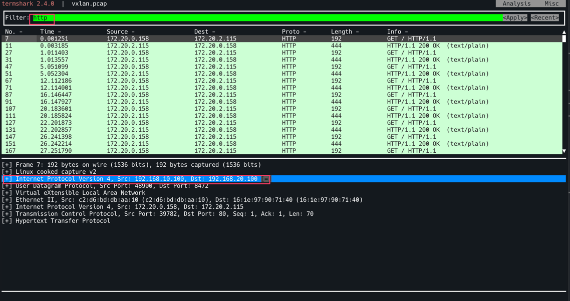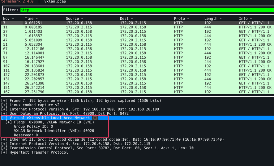 termshark -r /tmp/vxlan.pcap -d udp.port==8472,vxlan