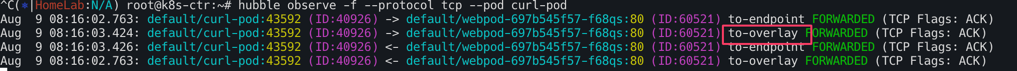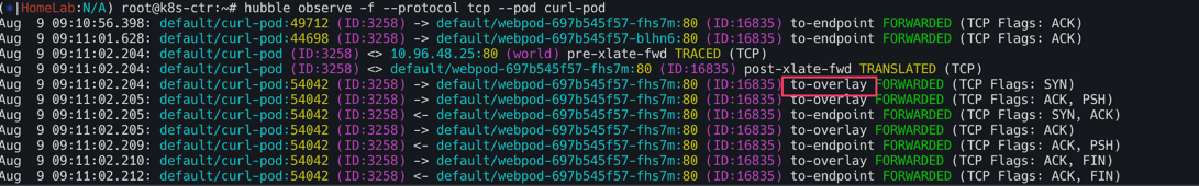 # 신규 터미널 [k8s-ctr] hubble flow log 모니터링 : overlay 통신 모드 확인!
