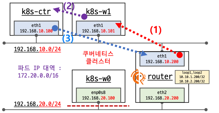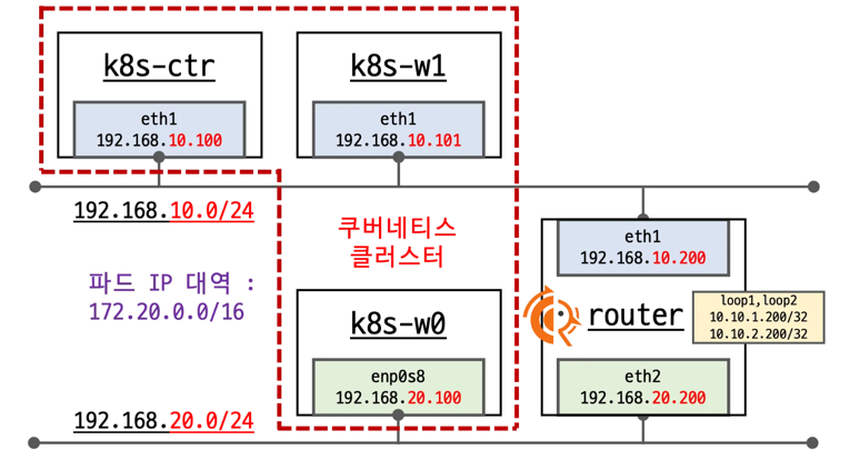 - k8s-w0 (192.168.20.0/24) - 192.168.20.100 (k8s-ctr/w1 노드와 다른 대역 배치)