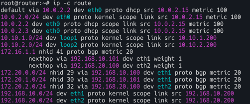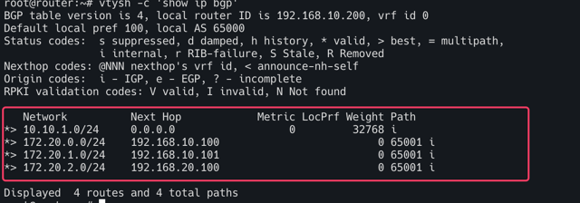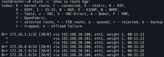 FRR 라우터의 전체 IP 라우팅 테이블을 보여준다.. BGP를 통해 학습된 경로 외에, 직접 연결된 네트워크(C)나 정적 경로(S) 등 모든 경로가 표시