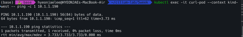 kubectl exec -it curl-pod --context kind-west -- ping -c 1 10.1.1.190