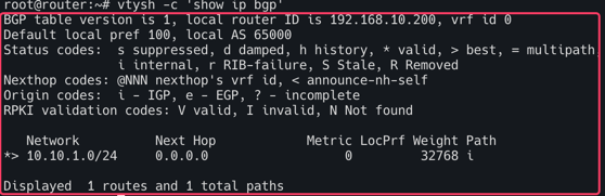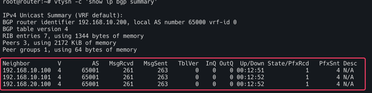 : 이 라우터가 AS(Autonomous System) 번호 65000에 속함을 나타낸다.bgp router-id 192.168.10.200