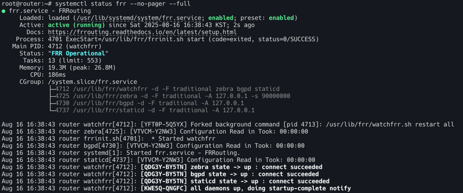 : 설정을 변경한 후, FRR 데몬을 재시작하여 변경 사항을 적용한다.