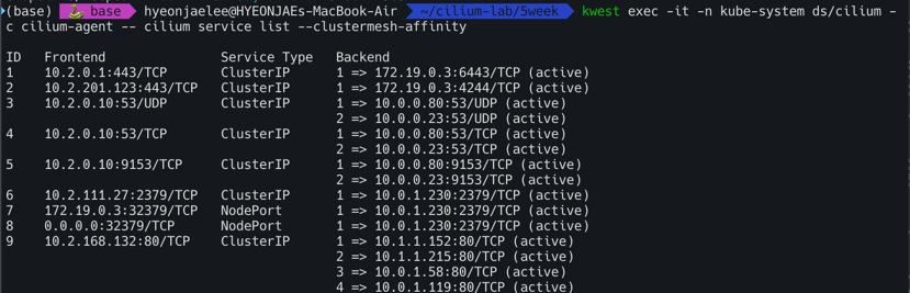 kwest exec -it -n kube-system ds/cilium -c cilium-agent -- cilium service list --clustermesh-affinity