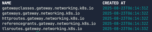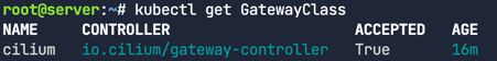 사전에 미리 CRDs를 설치했다면, 설치 도중에 Cilium에 의해 GatewayClass가 배포된다. (Gateway API 옵션이 선택되었다고 가정)