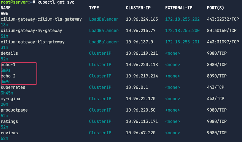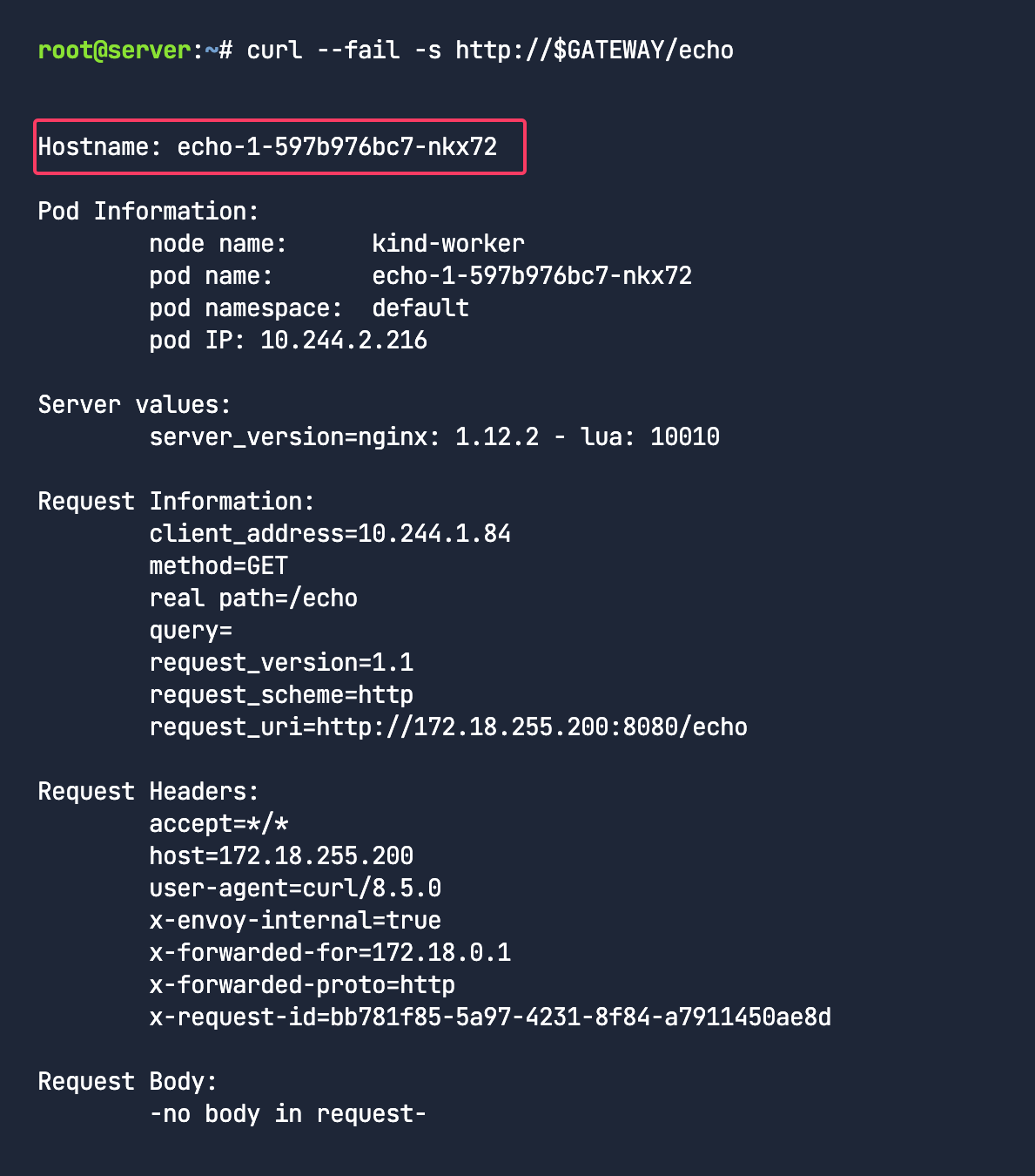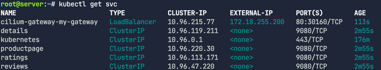 이라는 로드밸런서를 확인할 수 있다. 이 서비스는 Gateway API를 위해 만들어진 것이다.이 랩 환경이 시작될 때 Cilium이 설치되면서 LoadBalancer 기능이 활성화되었다. 따라서 Cilium은 이 기능을 이용해 자동으로 IP 주소를 할당하고, 이 IP 주소를 로컬 L2(레이어 2)를 통해 외부에 알린다. 사용자의 터미널에서 Gateway IP 주소로 연결이 가능한 이유가 바로 이 때문이다.