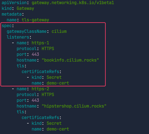 먼저, Gateway 섹션을 보면 gatewayClassName