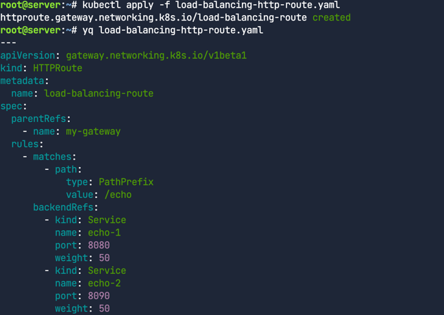 로 시작하는 HTTP 트래픽을 각각 8080 포트와 8090 포트로 echo-1 및 echo-2 서비스로 전달하는 역할을 함- 가중치 50 대 50으로 설정