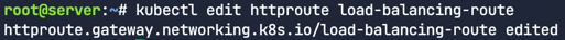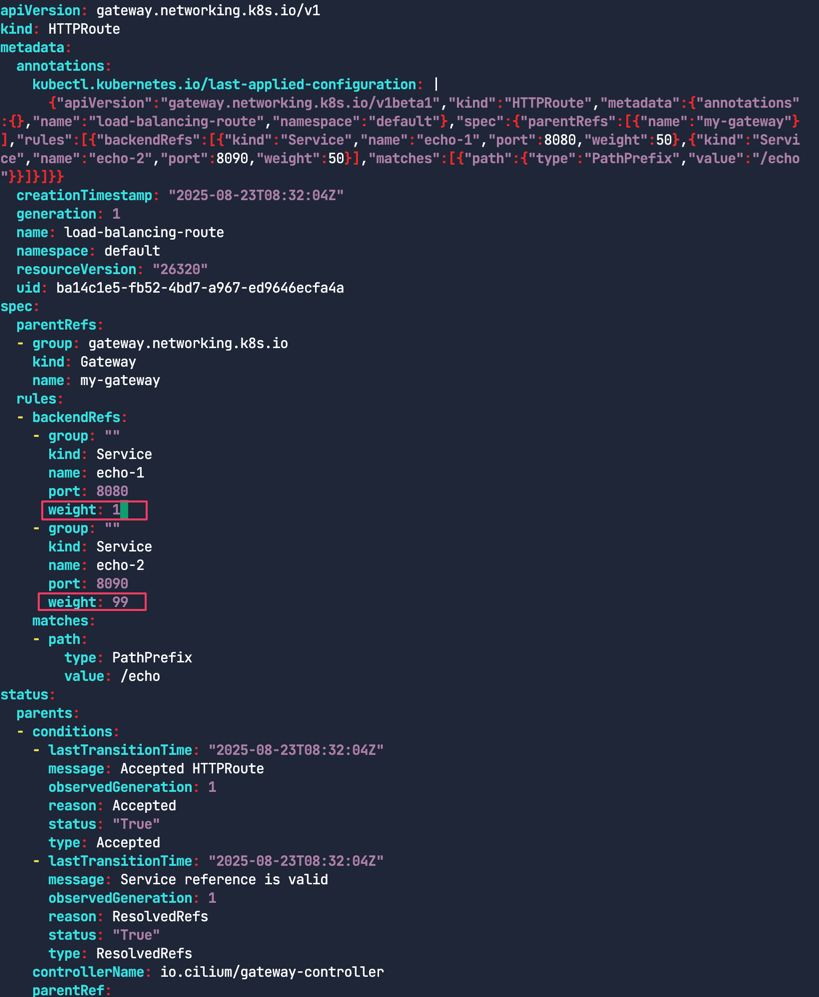 이전 매니페스트를 수정해서 다시 적용하거나, vi 에디터를 사용해서 API 서버에 있는 HTTPRoute를 직접 편집한다. echo-1과 echo-2의 가중치를 각각 50에서 echo-1은 1, echo-2는 99로 바꾸고 저장