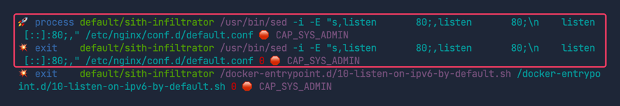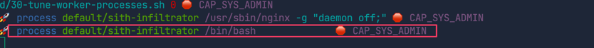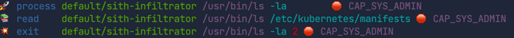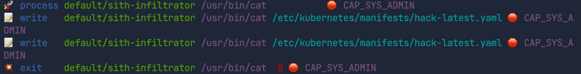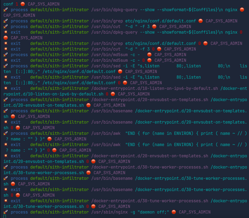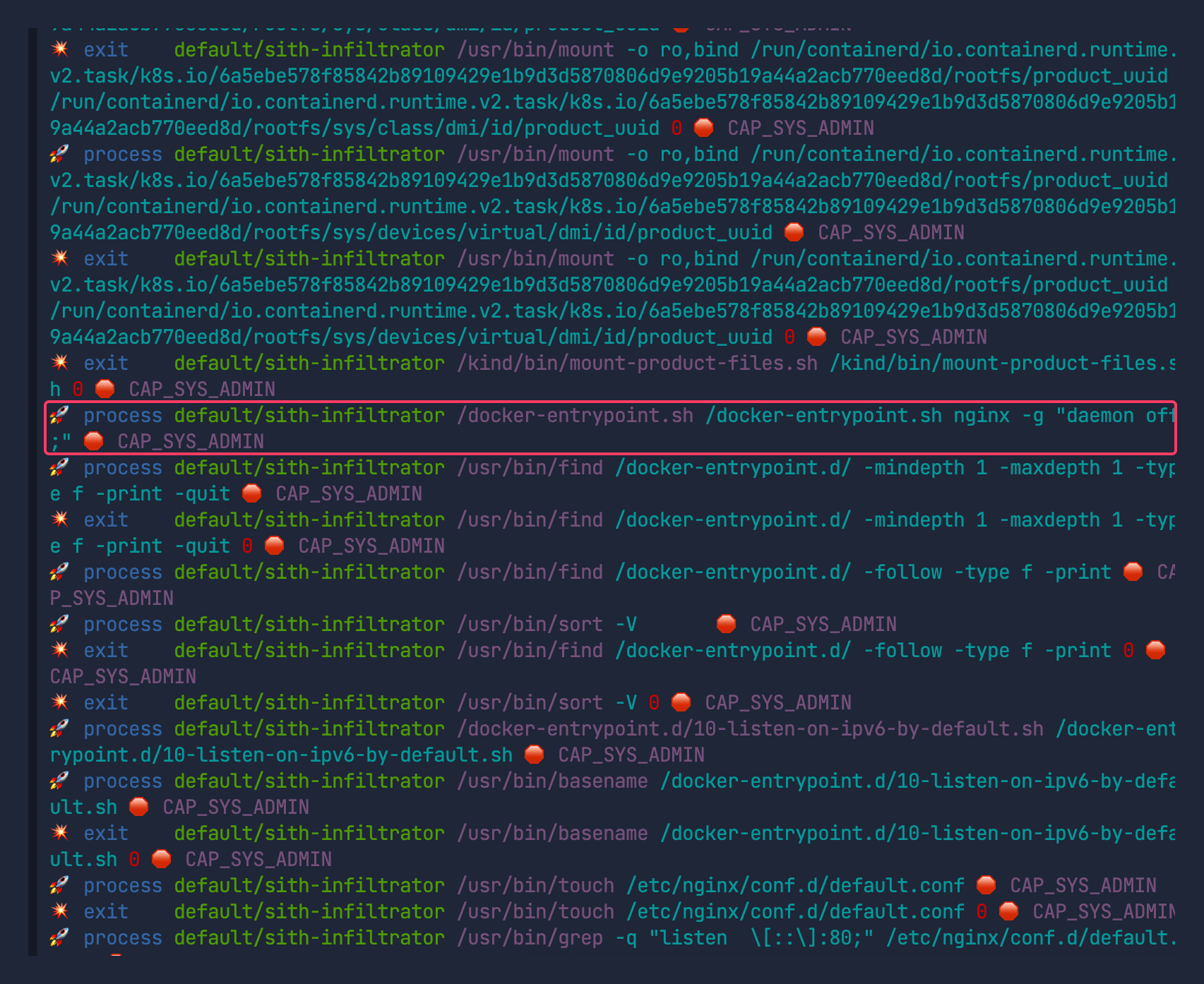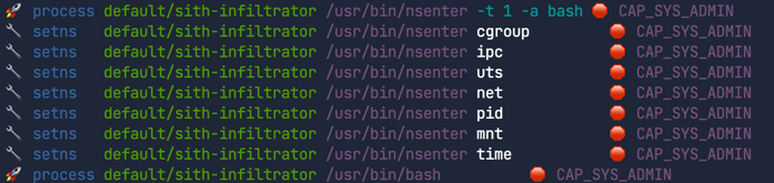 로 설정되었기 때문에, 해당 파드는 모든 리눅스 기능(capabilities)을 얻게 되었다. 예를 들어, 각 보안 관측가능성 이벤트의 끝에 CAP_SYS_ADMIN