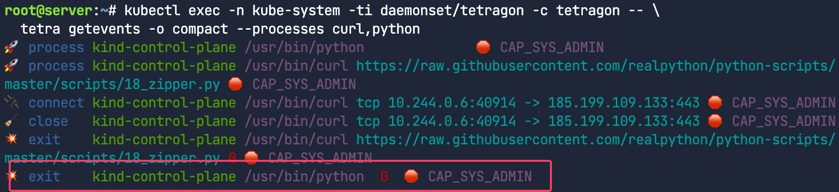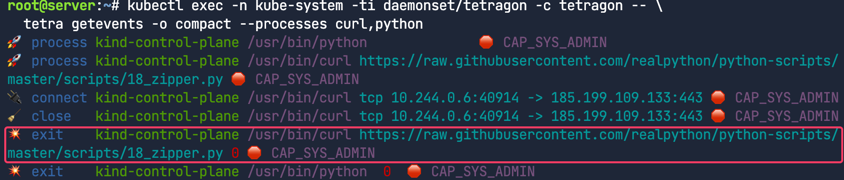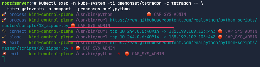 두번째 터미널에서는 Cilium Tetragon으로부터 수신하는 보안 관측가능성 이벤트를 세밀하게 조정하기 위해, curl 또는 python 프로세스 이름과 일치하는 이벤트들만 모니터링하기 시작할 것이다.