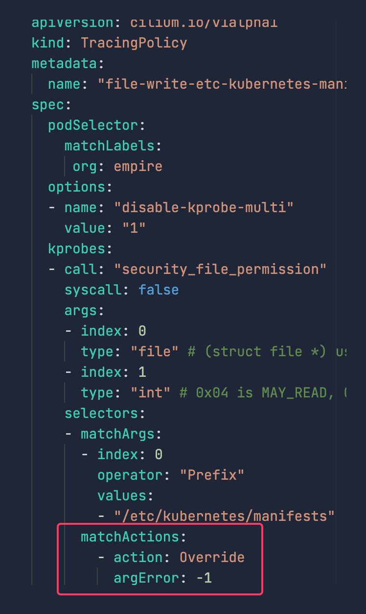 파일을 작성했을 때 문제가 발생했다는 점은 매우 중요하다. Cilium Tetragon의 TracingPolicy