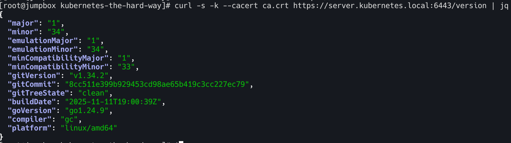 curl -s -k --cacert ca.crt https://server.kubernetes.local:6443/version | jq