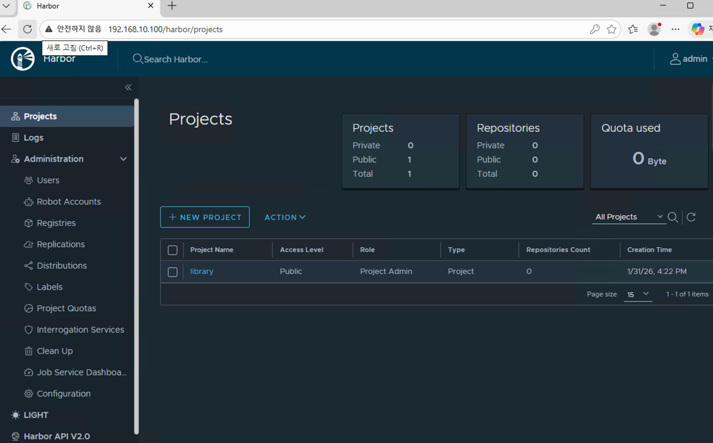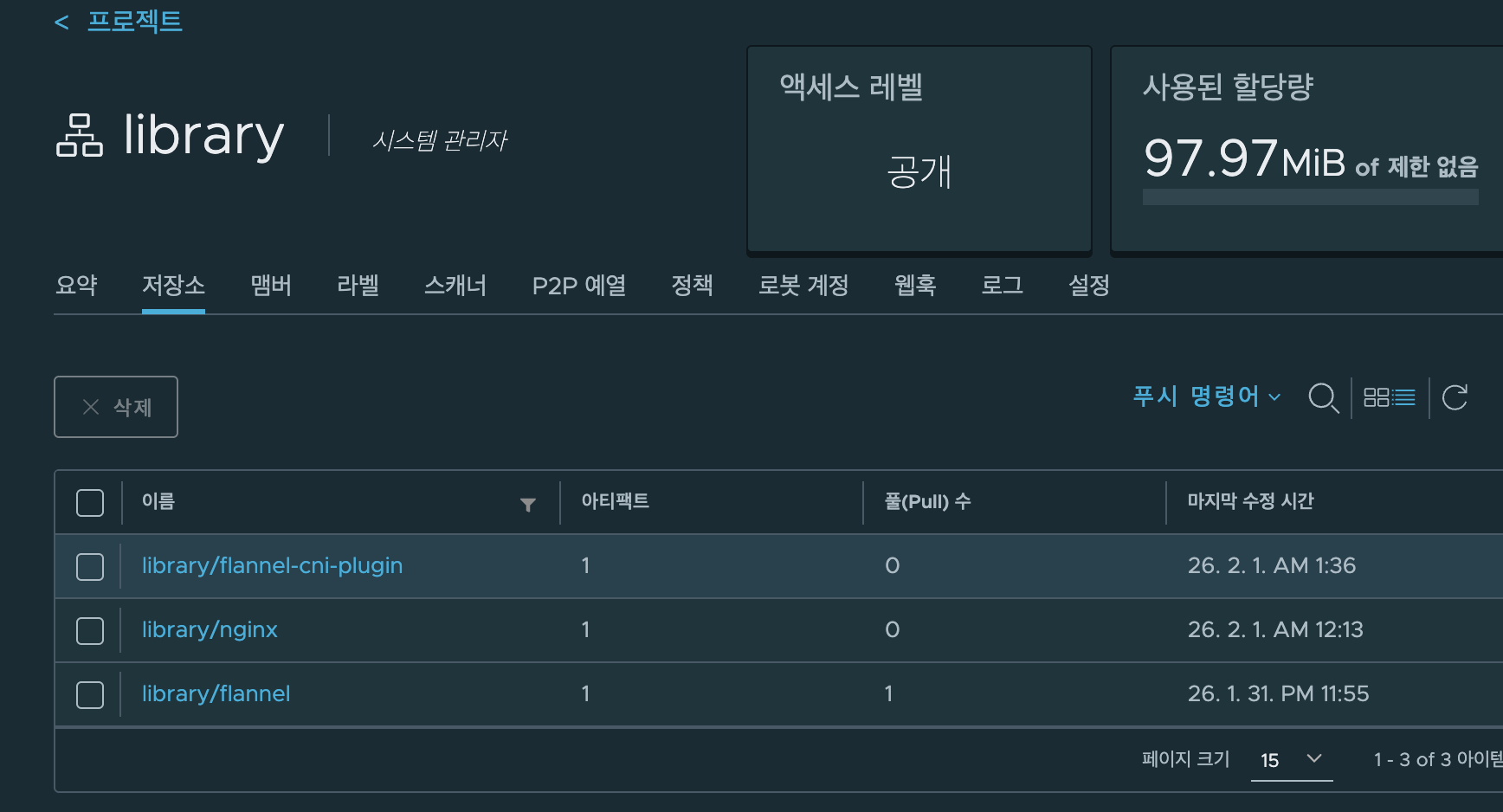 192.168.0.245로 바뀌면서192.168.0.245/flannel/flannel로 pulling을 시도한다. 하지만 habor서버에는 flannel 이라는 이름의 프로젝트가 존재하지 않으므로 계속 Not Found에러가 발생하였다. - 따라서 harbor 서버에서